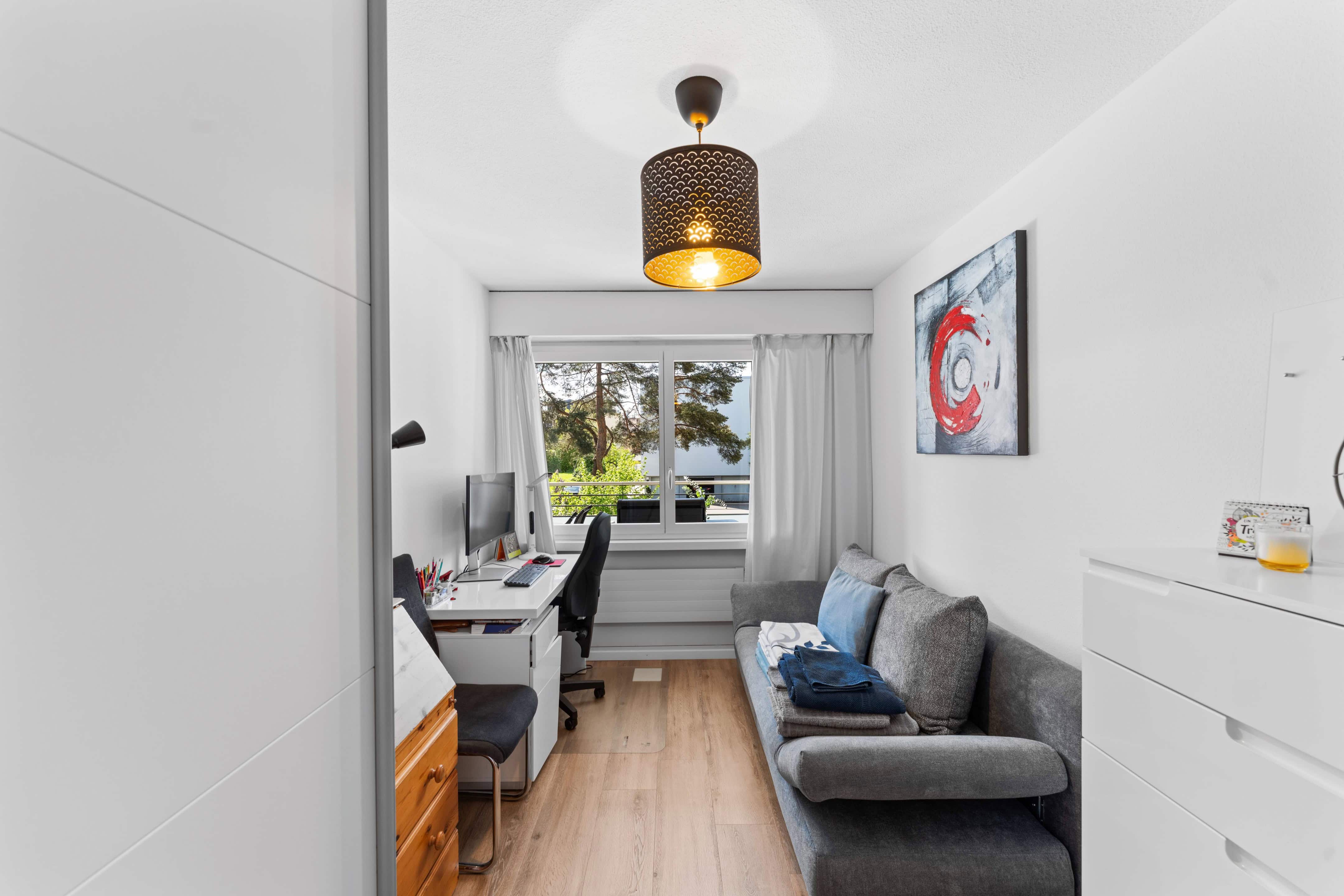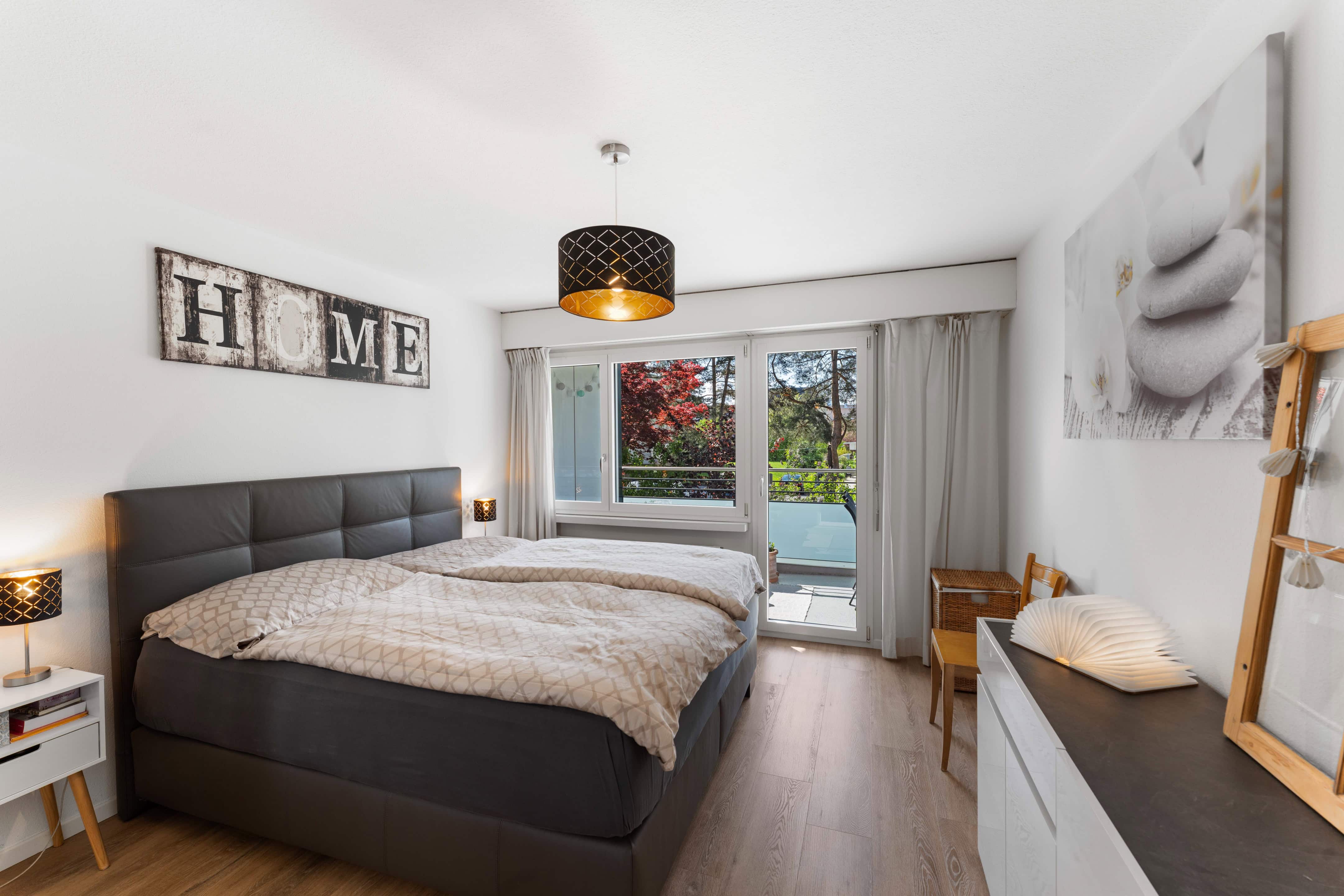 The following services are included: • Stylishly furnished 3.5-room apartment with living-dining room, bedroom, office (guest room), bathroom (shower, toilet, sink), and balcony • Bright, light-filled rooms • Network connections in all rooms • Fully equipped kitchen (cooking utensils, dishes, cutlery, etc.) • Flat-screen TV (including connection and subscription) • Free Wi-Fi internet • All utility costs (heating, water, hot water, and electricity) included • Bed linen and towels • Private washing machine in the apartment • Balcony with gas grill • Garage space in the underground garage included in the rent • Bicycle storage • Indoor pool for shared use